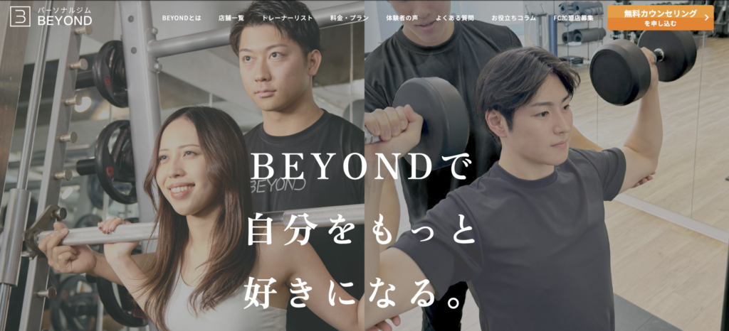 BEYONDは「カッコイイ、美しい体」の実現にこだわるパーソナルジムです。トレーナーは倍率50倍以上の厳しい選考をクリアした精鋭ぞろい。食事知識や生活習慣の改善まで含めた「一生モノの体づくり」が特徴です。