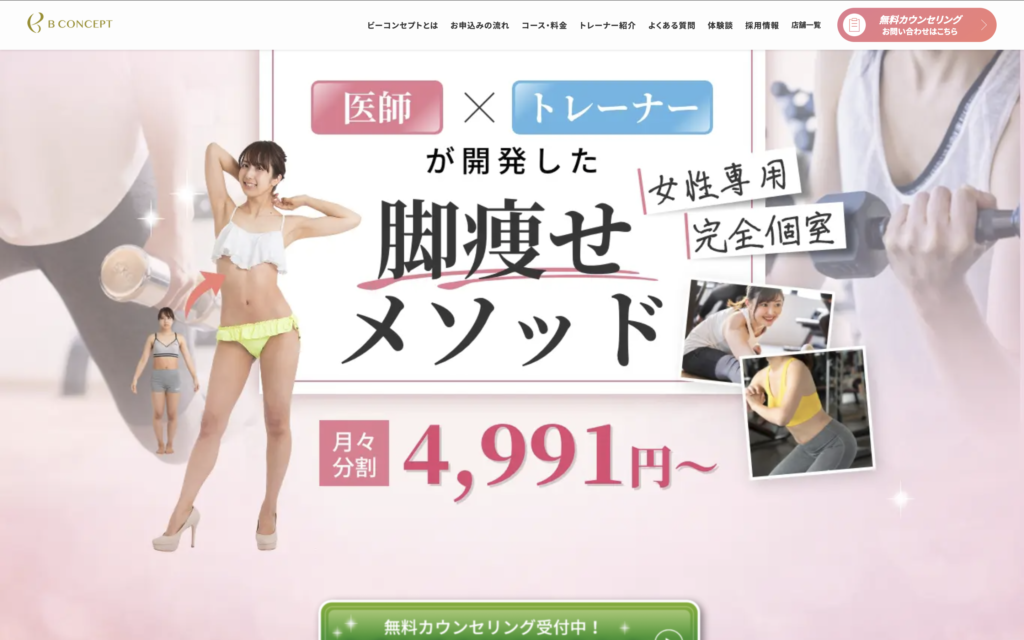 ビーコンセプトは医師とトレーナーが共同開発した独自メソッドで「脚痩せ」に特化した女性専用パーソナルジムです。完全個室で人目を気にせずトレーニングでき、産後ママには嬉しい託児所利用料の補助制度もあります。